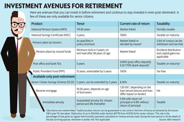 Among traditional investment choices for senior citizens are bank fixed deposits, Senior Citizen Savings Scheme (SCSS) and National Savings Certificate (NSC). Bank FDs give senior citizens an advantage by giving an interest rate that is 25-50 basis points higher than what other individuals get. The 8.3% interest on SCSS is also attractive. One basis point is one-hundredth of a percentage point.